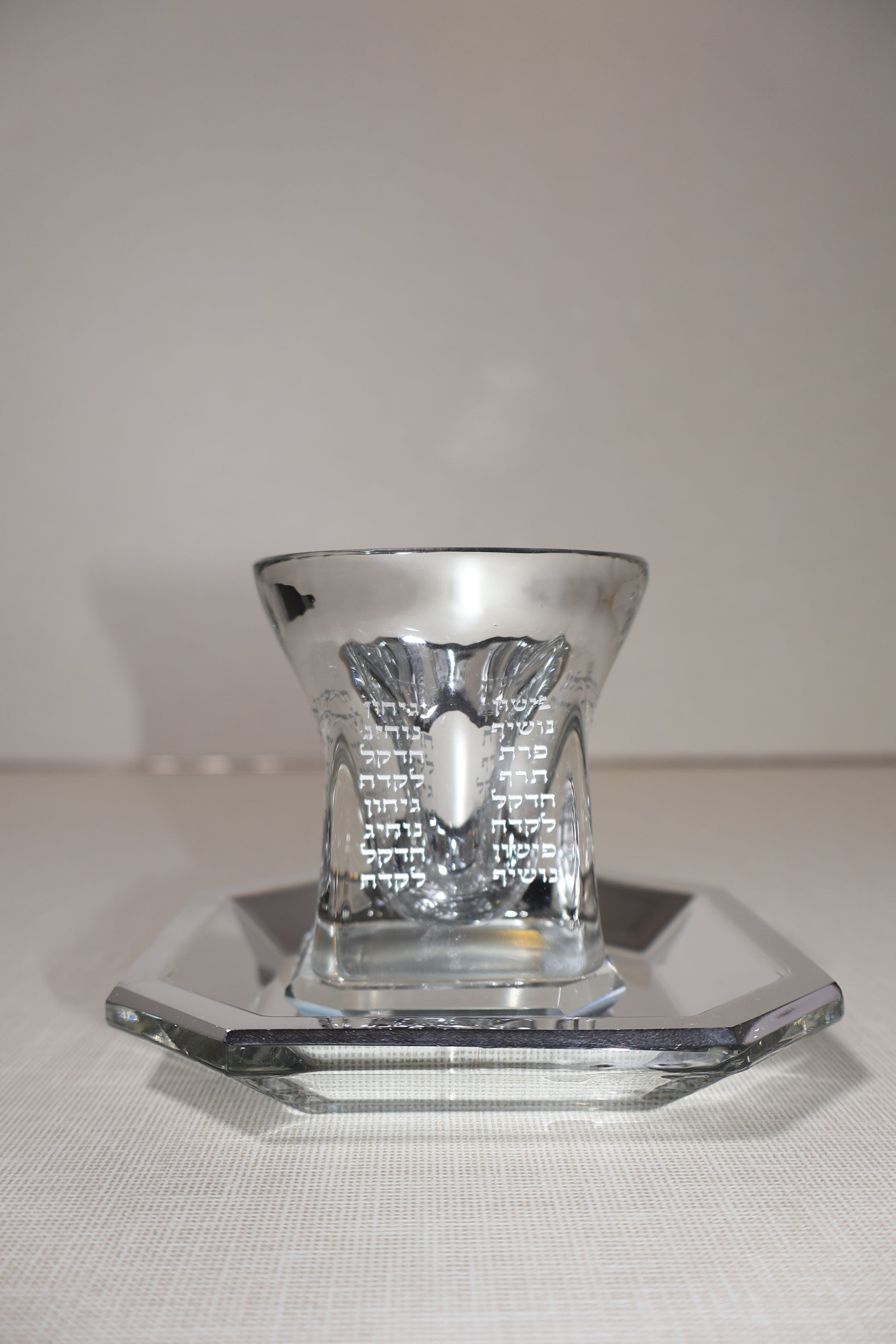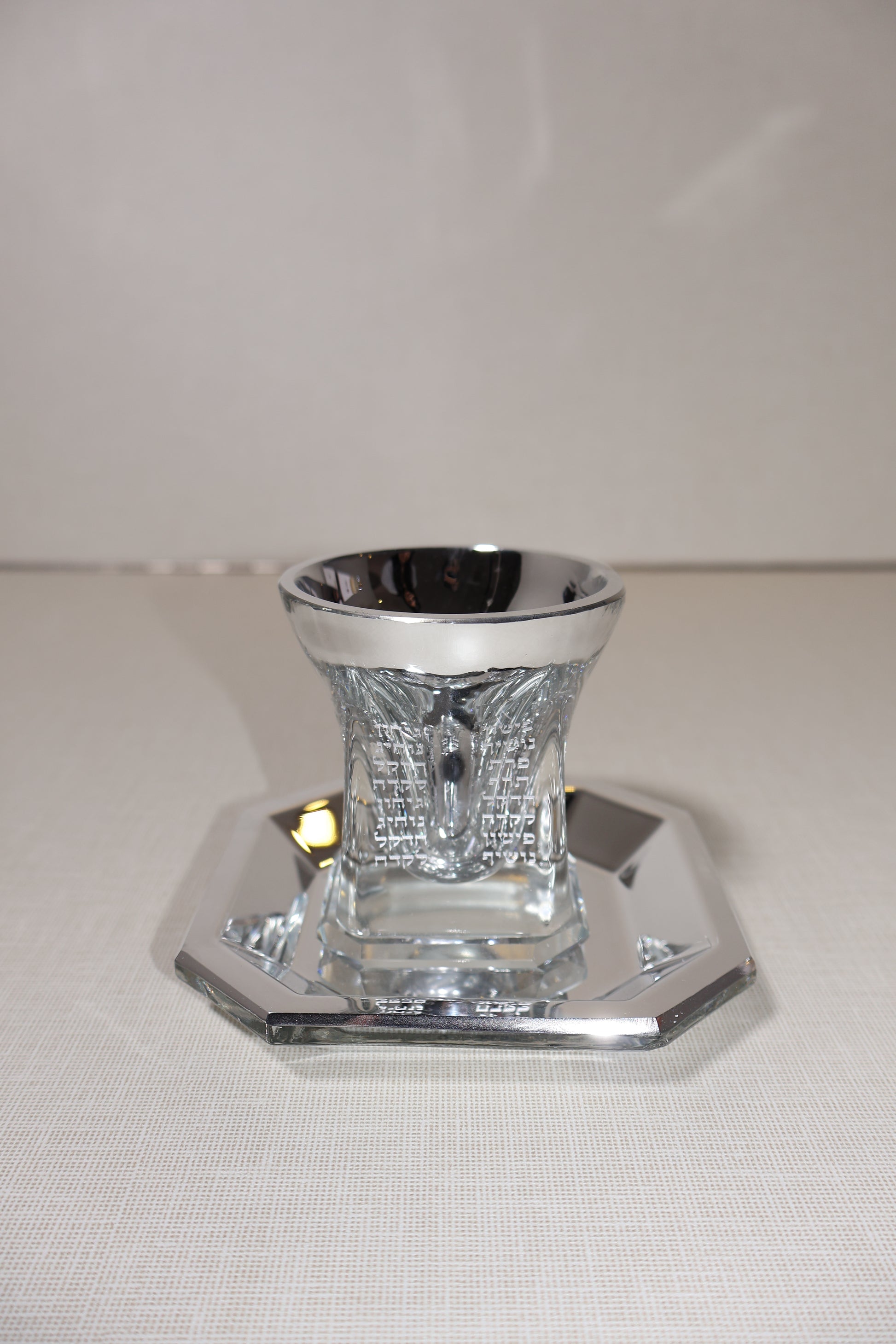 גביע קריסטל מהודר בגימור מראה , עם בסיס מרובע אלגנטיות וחריטת שמות הנהרות הקדושים בגן העדן . עיצוב מיוחד המעניק נופך רוחני לשולחן השבת והחג.