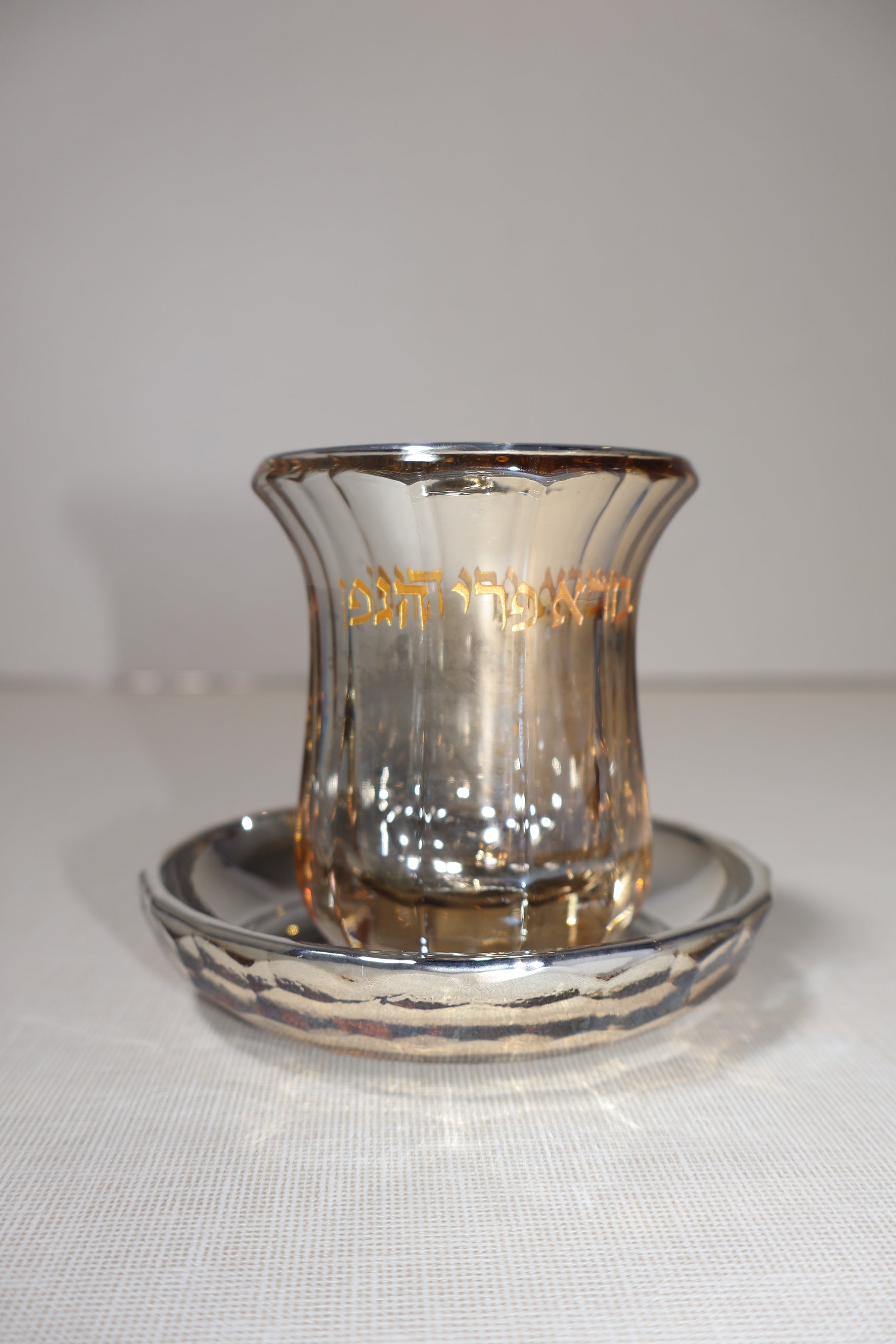 גביע קריסטל בעיצוב אלגנטי בגוון שמפנייה , עם חריטת כיתוב מוזהב "בורא פרי הגפן" . מתאים לקידוש שבתות וחגים או כמתנה מכובדת.