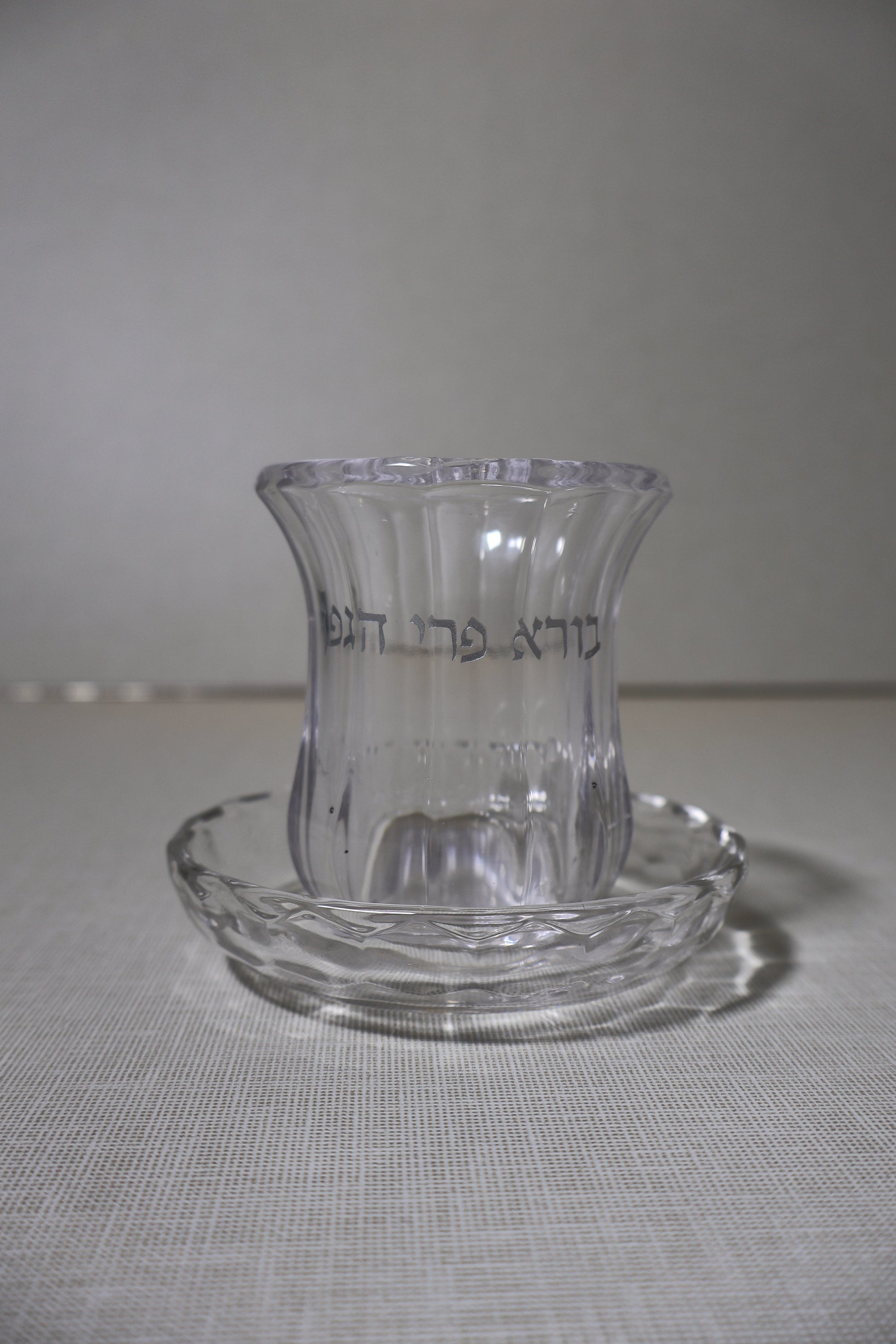גביע יין בעיצוב קלאסי בגוון שקוף , עם בסיס עגול וחריטת הכיתוב "בורא פרי הגפן" .