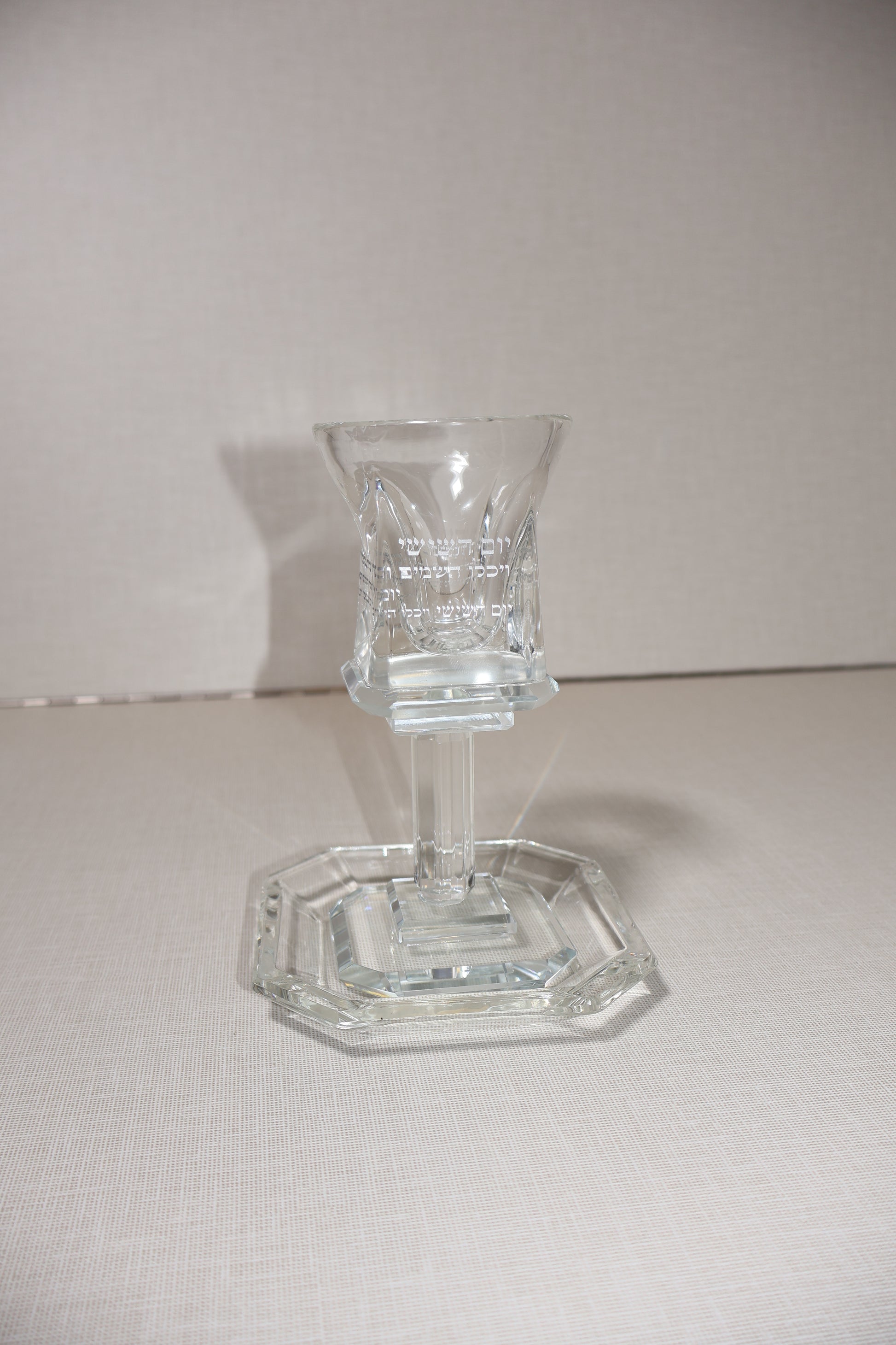גביע קריסטל יוקרתי בגוון שקוף , עם בסיס מרובע עליון וחריטת כיתוב של תפילת "יום השישי" .
