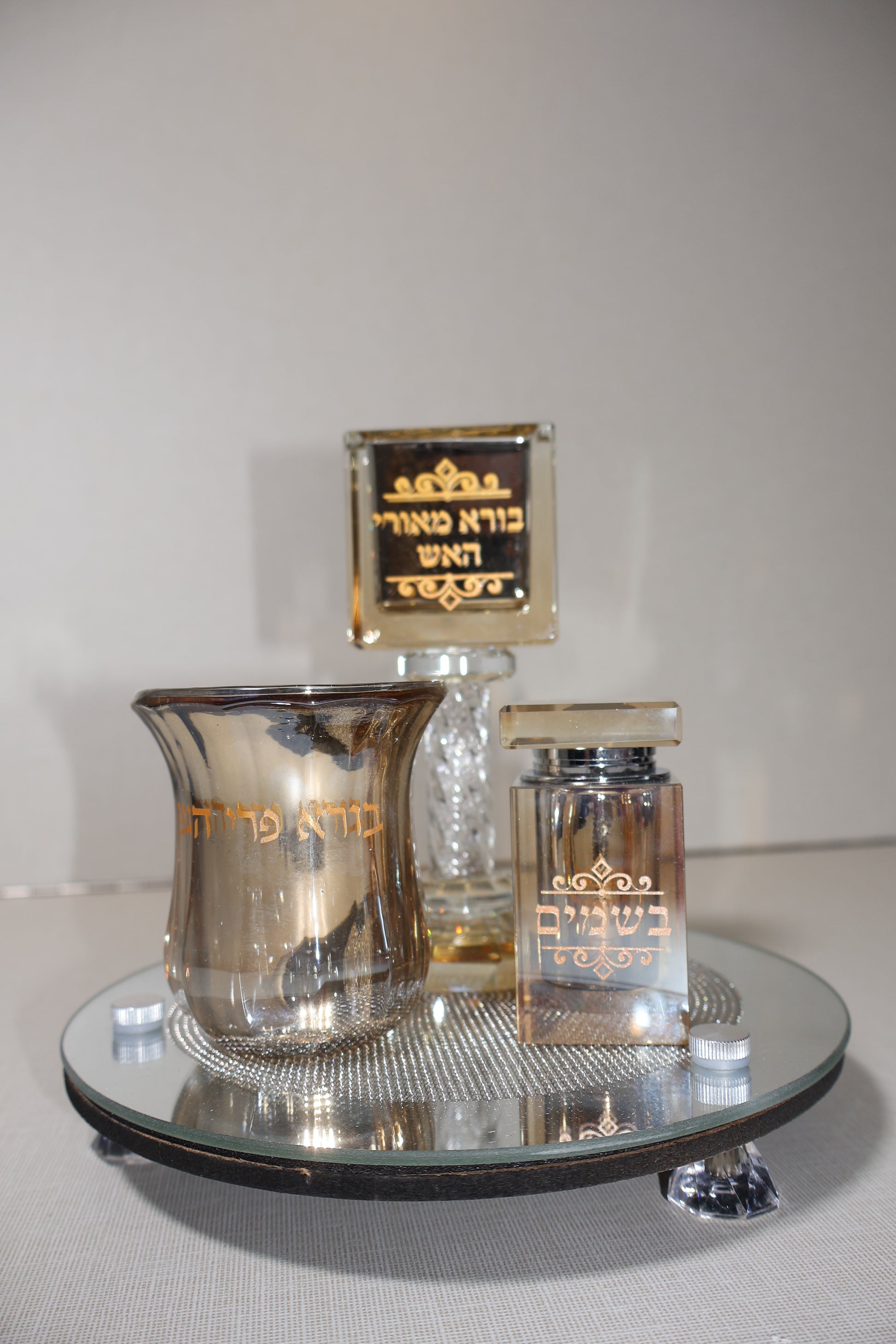 - גביע יין: קריסטל שמפנייה בשילוב מראה עם חריטת "בורא פרי הגפן"