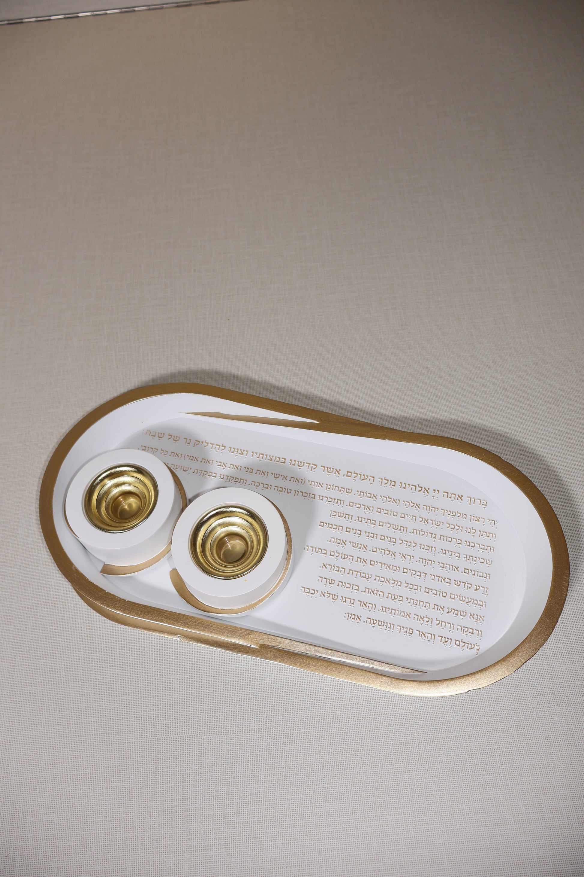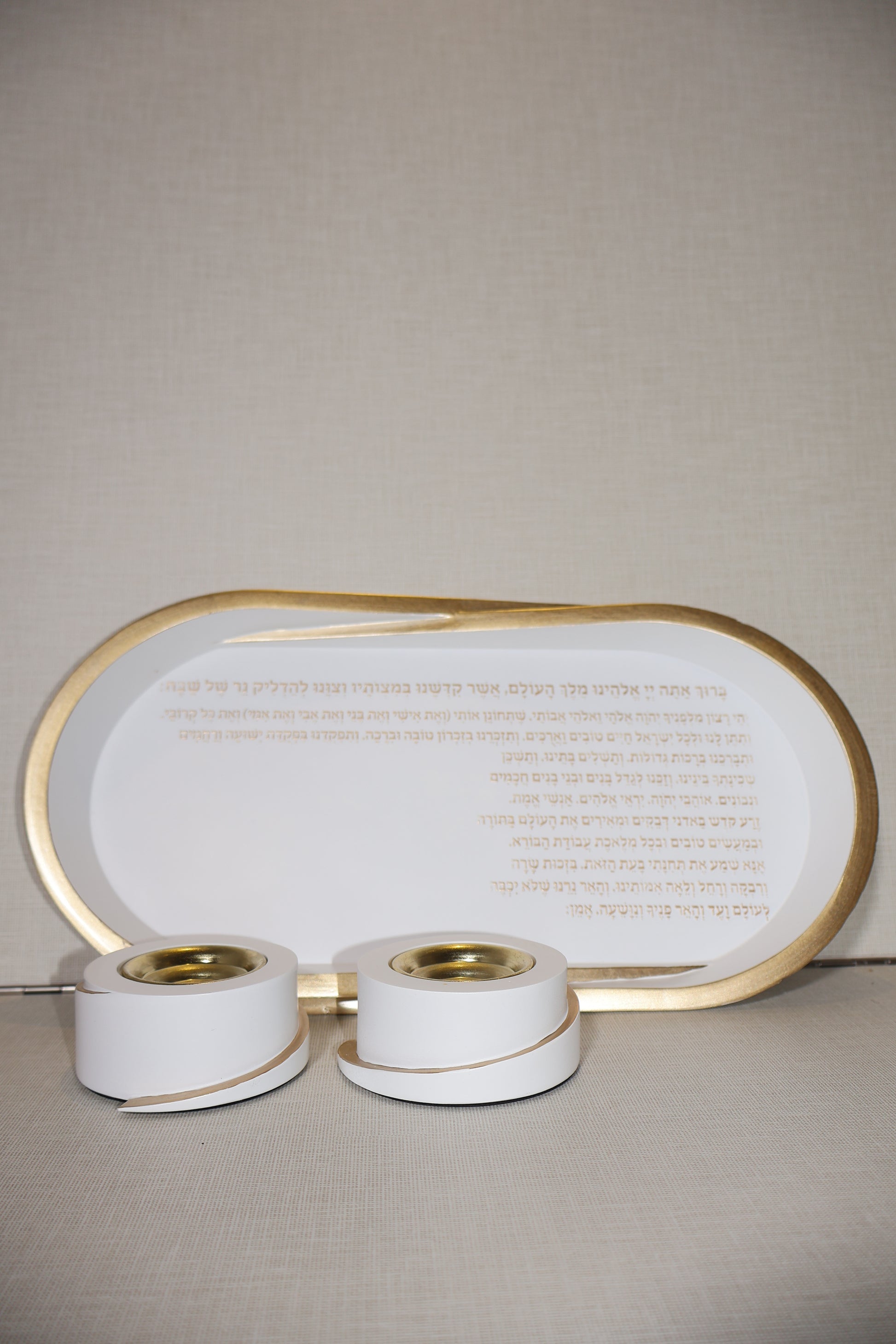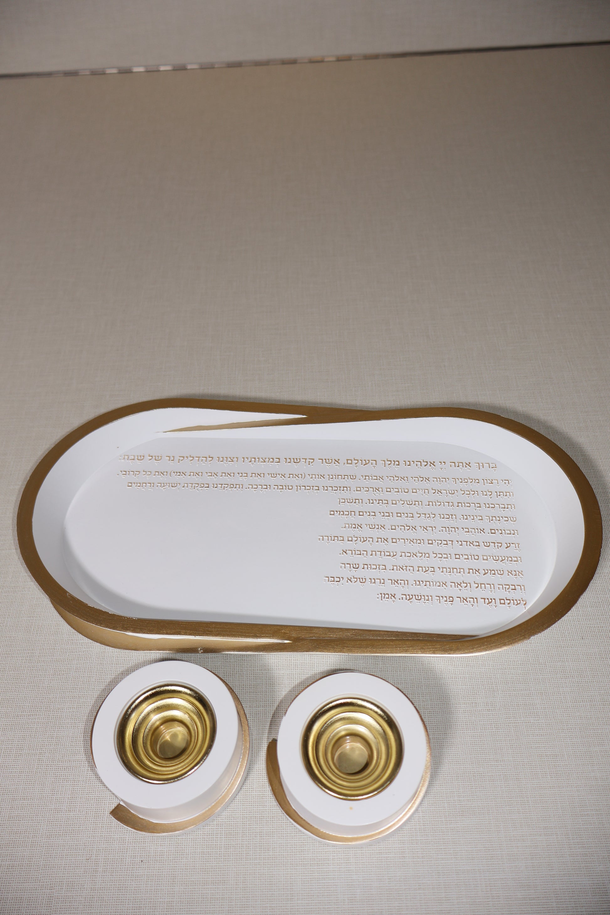 הסט מגיע עם חריטת ברכת הדלקת נרות וזוג פמוטים מהודר הניתן להזזה בהתאם לבחירת הלקוח.