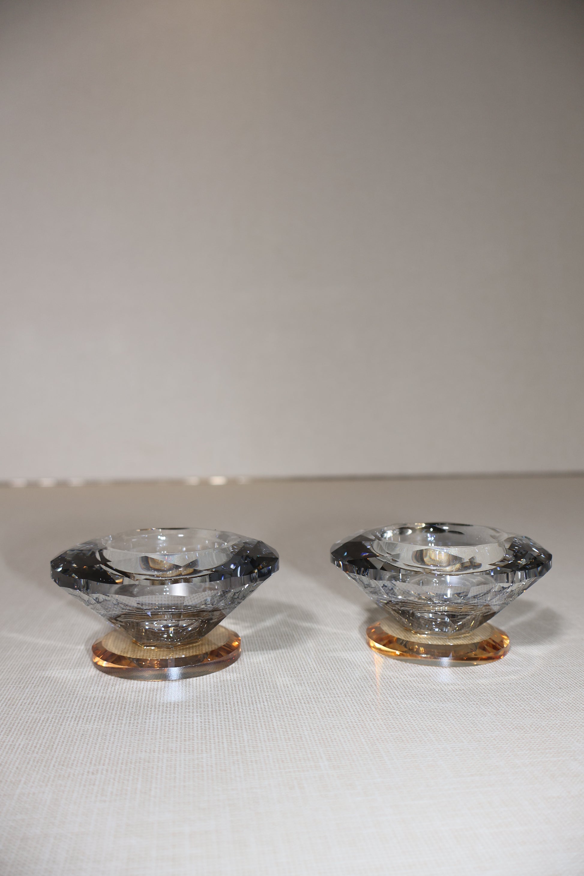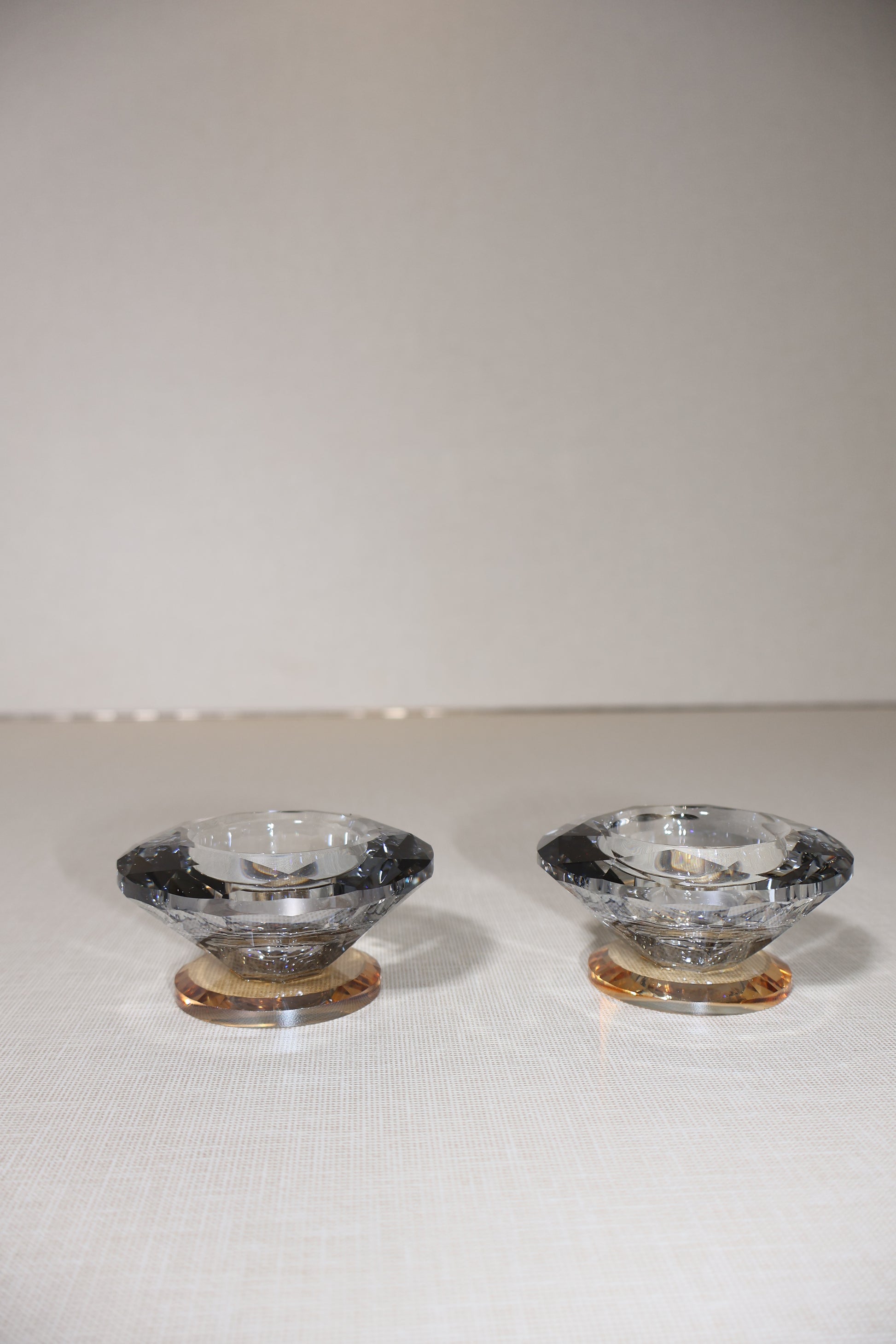 זוג פמוטי קריסטל יוקרתיים בעיצוב יהלום שטוח ומודרני. הפמוטים בעלי חיתוכים מרהיבים המבליטים את הברק והזוהר, עם בסיס עגול בגוון ענברי עדין המוסיף חמימות וייחודיות.