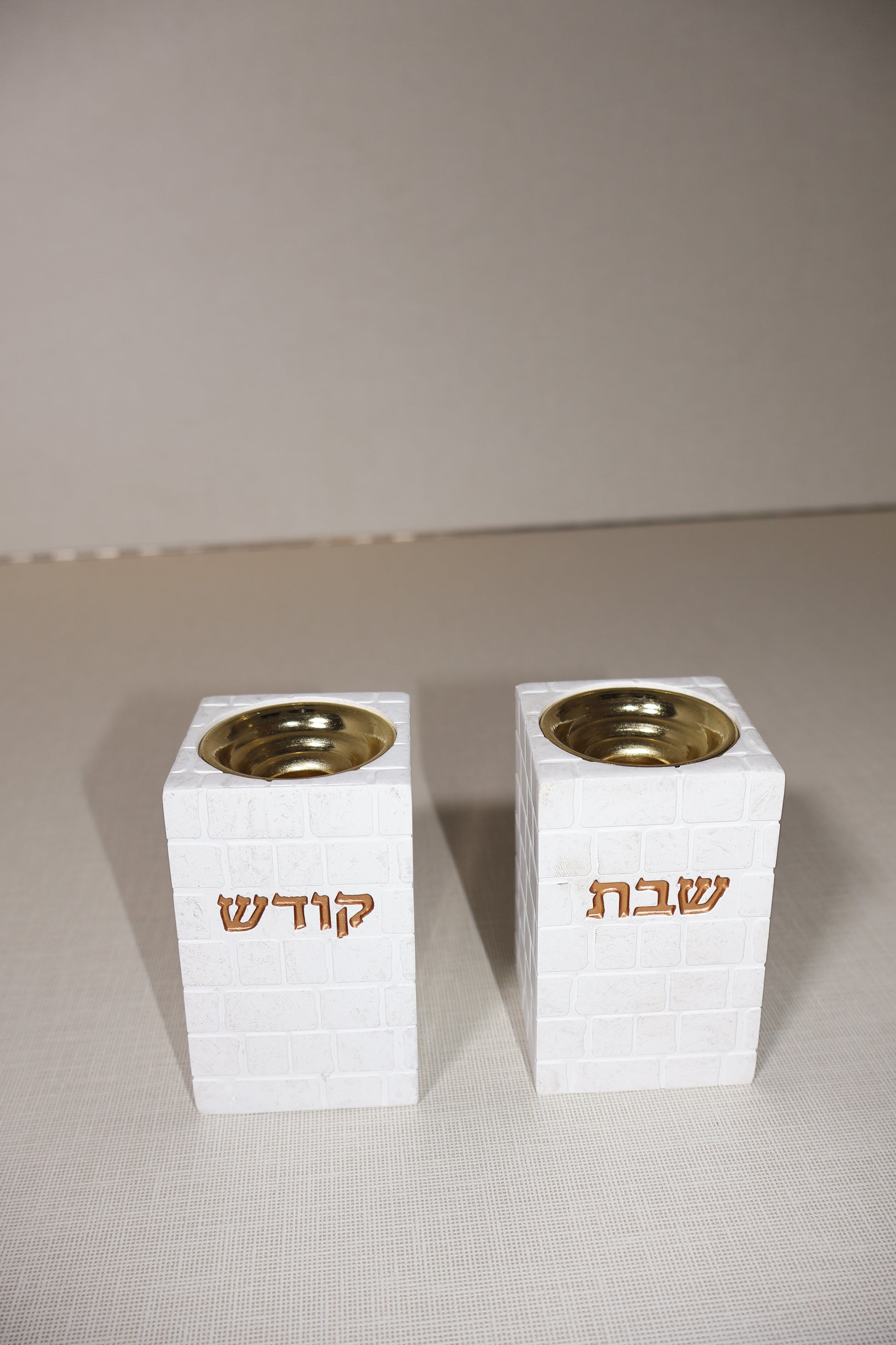פמוטים ייחודיים ב12 ס"מגובה, פולימר חזק ואיכותי, בעיצוב המדמה את אבני הכותל בגוון לבן נקי. על גבי הפמוטים המילים "שבת" ו"קודש" בצבע מוזהב, מוסיפות תחושת קדושה וזוהר.