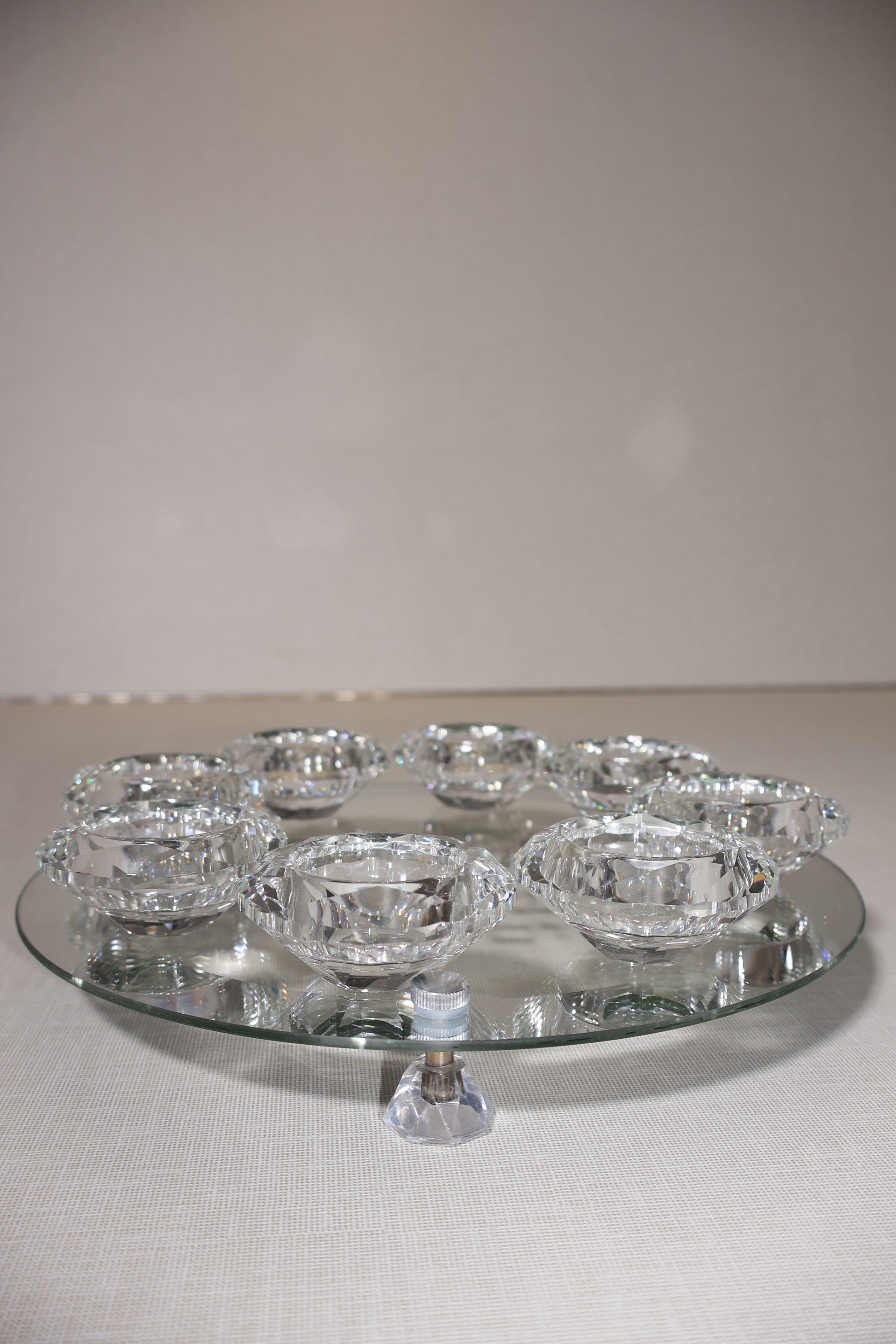 סט קריסטל יוקרתי ומרהיב בעיצוב עגול, כולל שמונה בתי נר המונחים על מגש מראה מהודר. במרכז הסטוט הכיתוב "שבת ויום טוב", המקרין אווירה קדושה ובחרת.