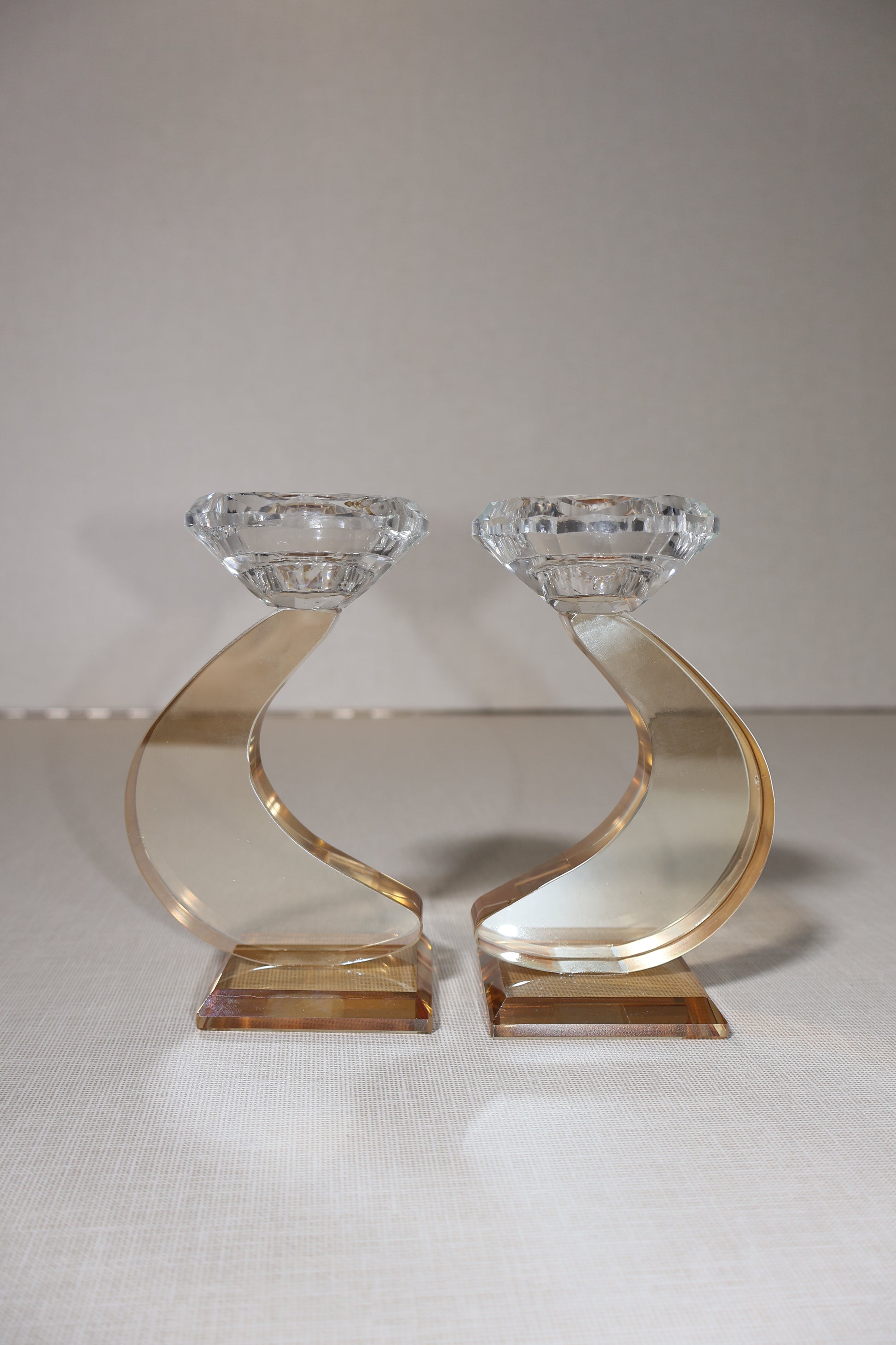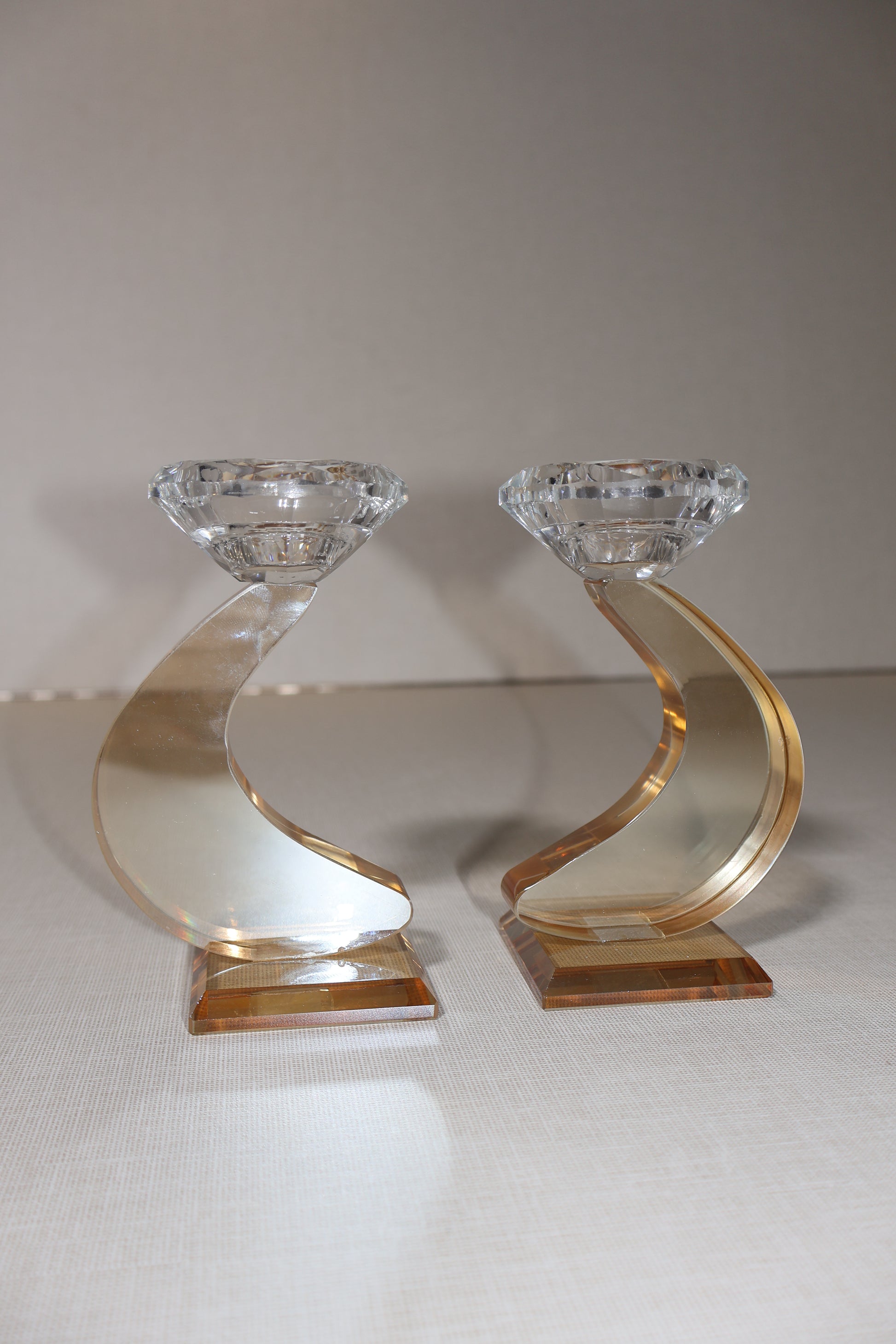 זוג פמוטי קריסטל יוקרתיים בעיצוב מודרני ומיוחד, עם קווים מעוגלים המדמים תנועה זורמת ואלגנטית.
