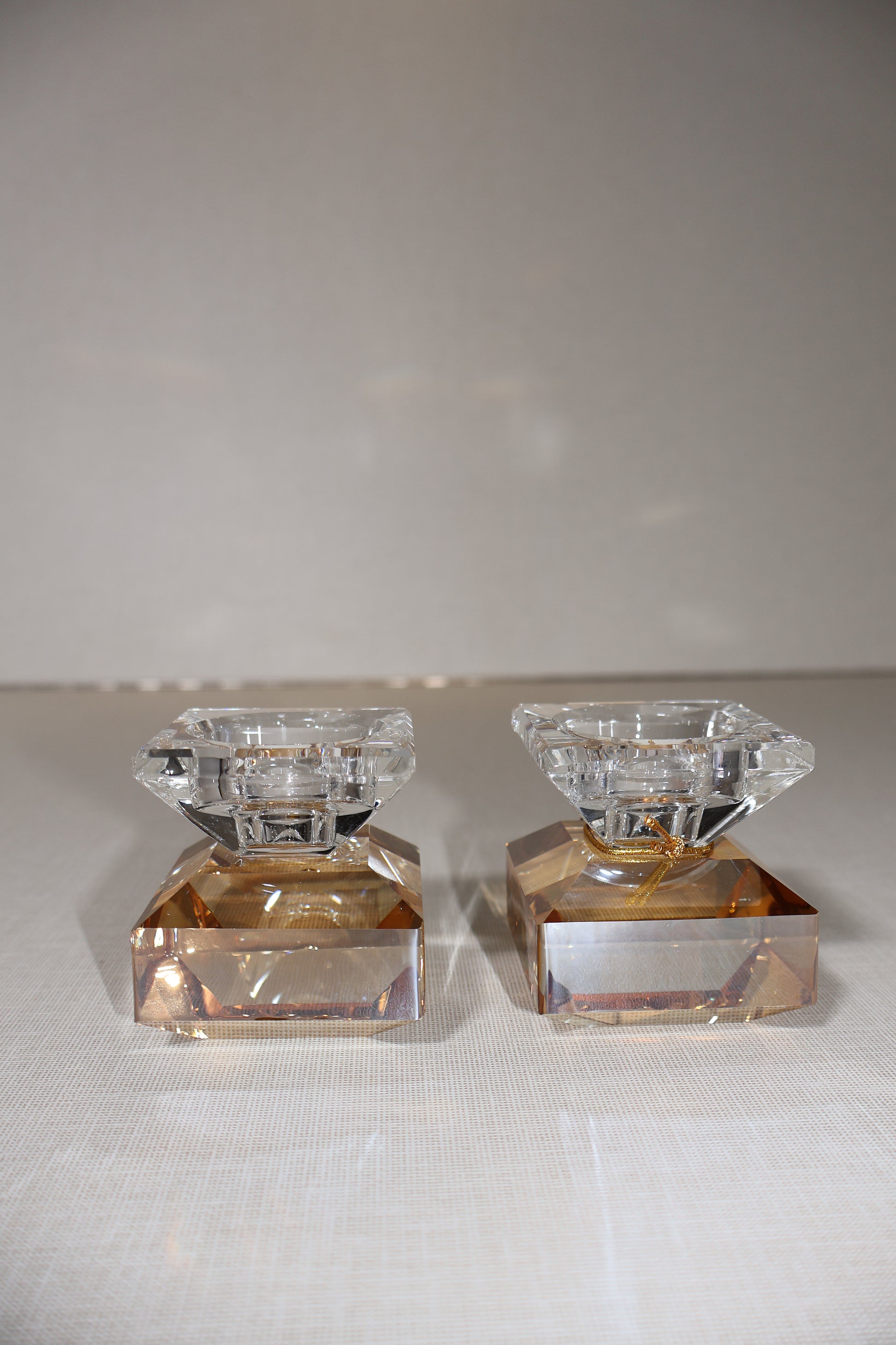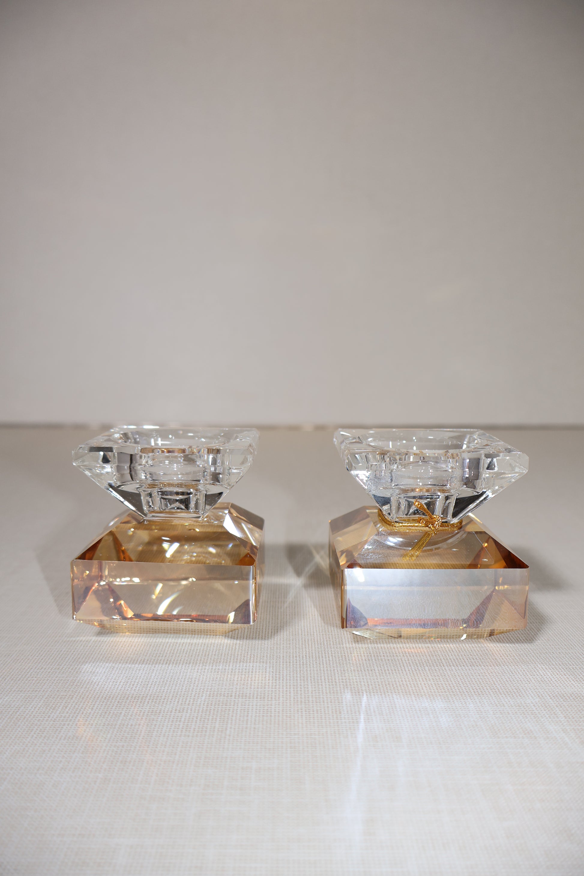 זוג פמוטי קריסטל יוקרתיים בעיצוב מרובע עם בסיס ייחודי המדמה חיתוך יהלום. הפמוטים משלבים שקיפות קריסטלית עם גוון שמפניה עדין, מה שמעניק להם מראה ומודרני.