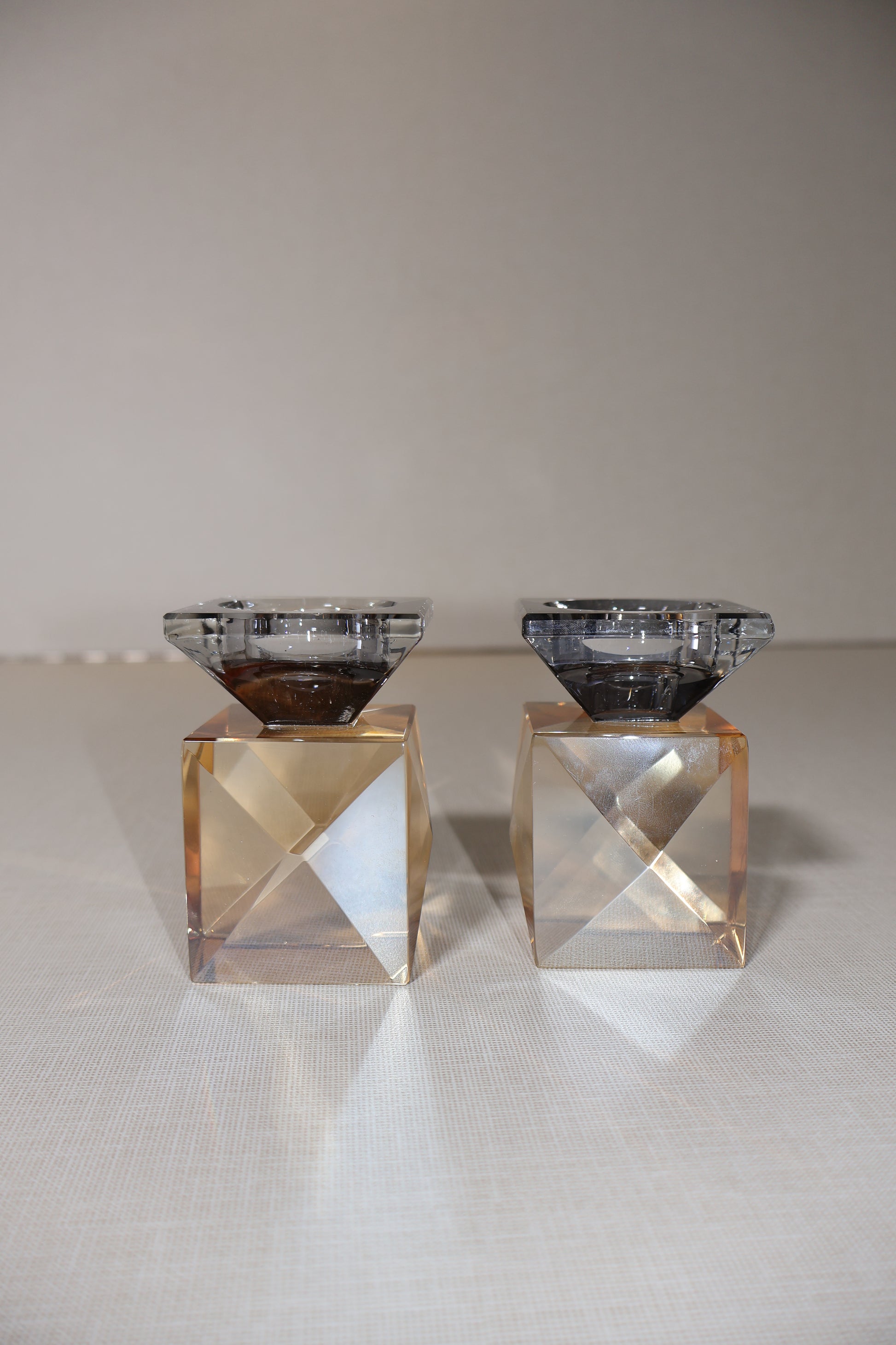 זוג פמוטי קריסטל בעיצוב יוקרתי עם בסיס מרובע בגימור שקוף-ענברי, בשילוב חלק עליון בגוון קריסטל מעושן. הניגוד בין הגוון החמים של הבסיס הצלילות המעושנת מעניק לפמוטים מראה מודרני, וייחודי אלגנטי.