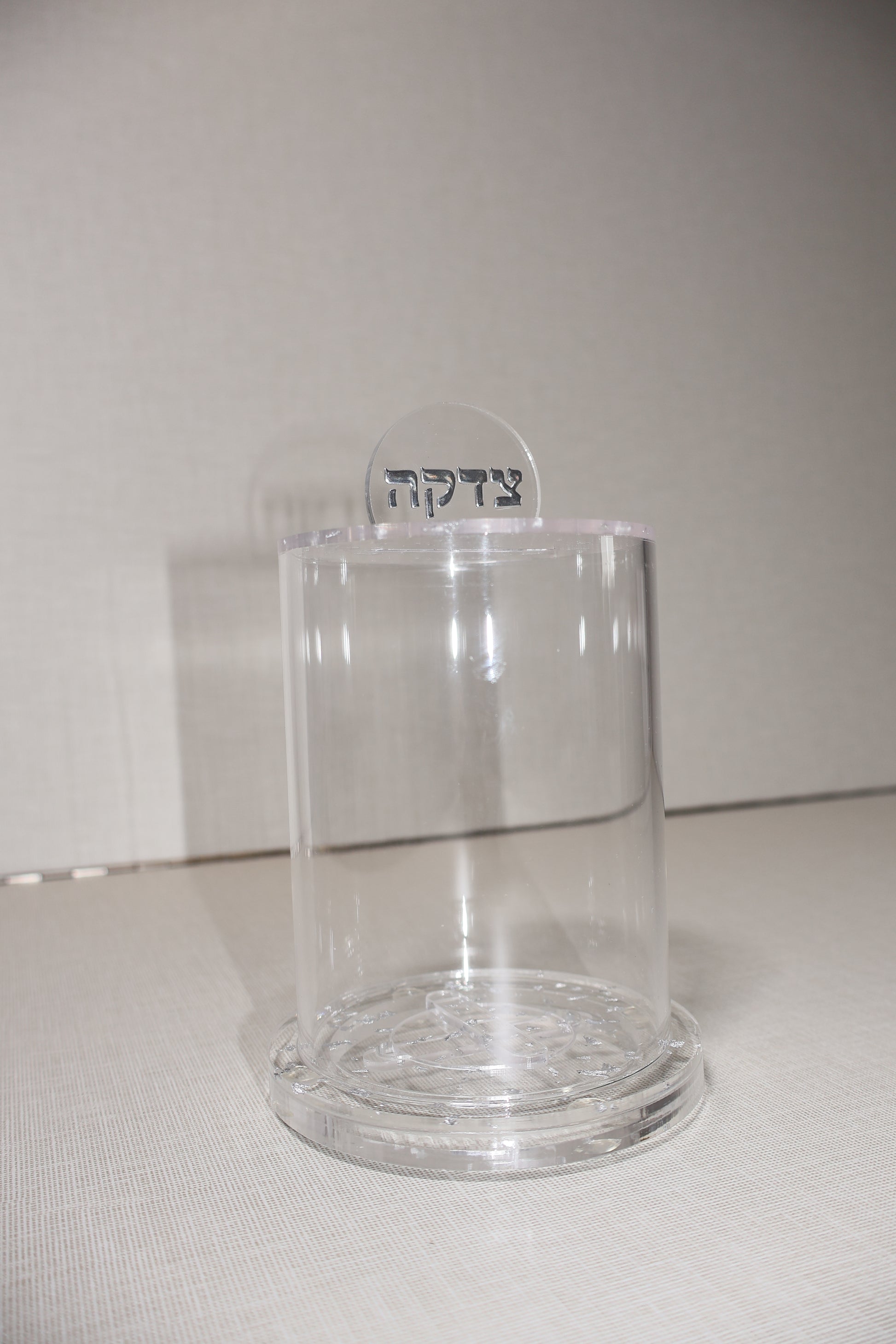קופת צדקה מהודרת בעיצוב עגול מ אקריליק שקוף בשילוב שבבי כסף . קופה מושלמת ומרשימה, מתאימה לבית, למשרד או כמתנה ייחודית.